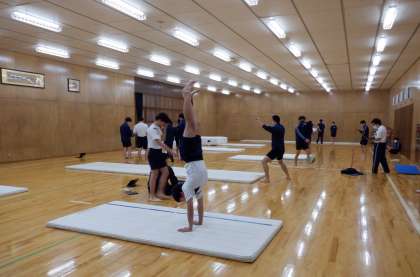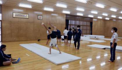 3−A・Dの男子の体育の授業の様子です。マット運動をしています。いくつかの技を組み立てて、12月には発表会を予定しています。
