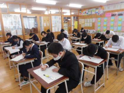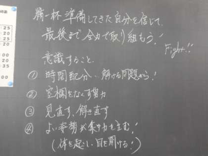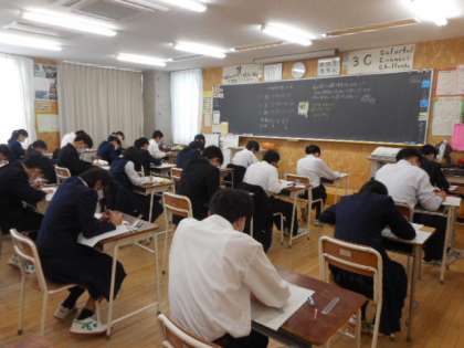 期末考査1日目 3学年 公開日 2022/11/24 更新日 2022/11/24 芝園の一日 11月24日(木) 1限 3学年の期末考査の様子です。数学のテストに取り組んでいます。黒板には、担任の先生からのメッセージが書かれていました。真剣に頑張っています!