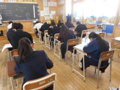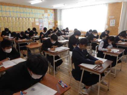 2学年の期末考査の様子です。英語のテストに取り組んでいました。リスニングや英作文など、普段の授業で学習した内容を確認します。力を発揮できるといいですね。頑張れ2年生。