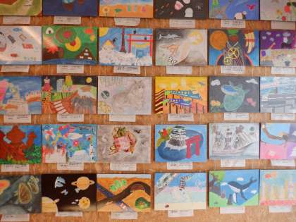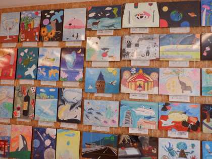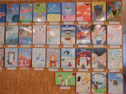 2年生の学年フロアには、美術作品「空想の世界」おパネルが展示してあります。生徒一人一人の個性溢れる作品ばかりです。色合いもとってもカラフルで、見応えたっぷり。