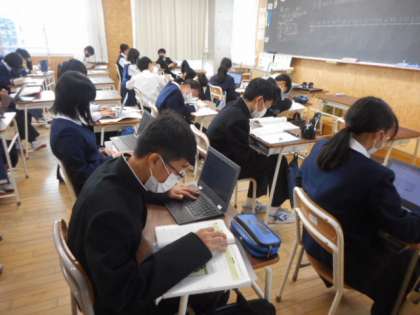 1−Cの数学の授業風景です。クロームブックを活用して、大きな数の計算をしました。電卓機能や様々な機能を活用して、意欲的に学習に取り組みました。