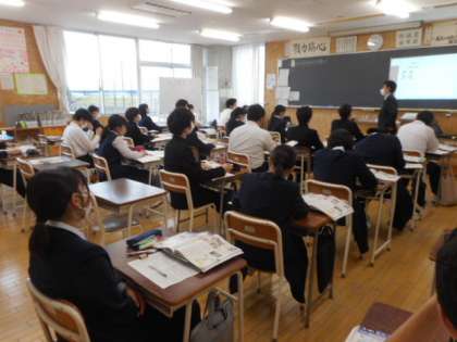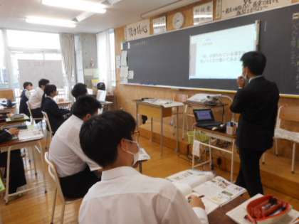 3−Aの社会科の授業風景です。公民の分野で、経済の仕組みについて学習しています。真剣に話を聞く姿勢が素晴らしいですね。頑張れ3年生!