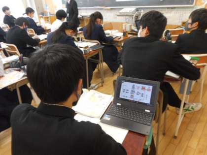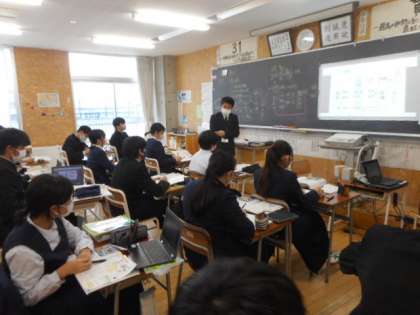 3−Dの社会科の授業風景です。公民の分野「経済の仕組み」について学習しました。実際に商品を売るときのことを想定して商品の価値や価格の決定について確認しました。