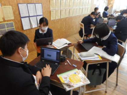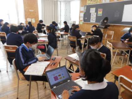2−Cの家庭科の授業風景です。消費生活について考えました。クロームブックのジャムボードを活用して、グループで意見を交流し、考えを深めました。