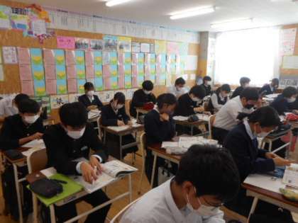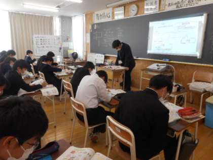 3−Aの社会科の授業風景です。流通のしくみについて学習していました。公民では、経済や流通のしくみなどを学ぶことを通して、社会生活に興味や関心をもてるようにしています。