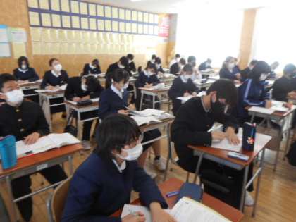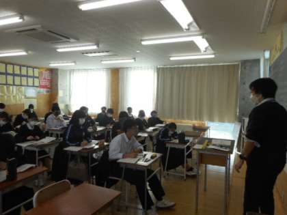 2−Aの数学の授業風景です。二等辺三角形の証明問題に取り組みました。三角形の性質を捉え、証明します。友達と相談しながら答えを導きました。