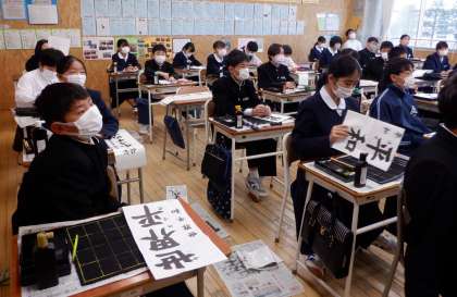1−Cの国語の授業風景です。書き初めの練習をしています。1年生は「世界平和」を楷書で書きます。みんな真剣に先生の話を聞いています。