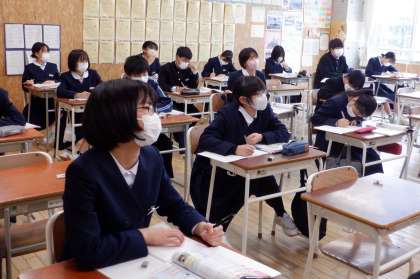 2−Cの技術の授業風景です。資源の再利用に向けた「5R」について学習をしています。リデュース、リユース、リサイクルの3Rに、リペア、リフューズを加えたのが「5R」。環境に目を向けて生活していきたいですね。