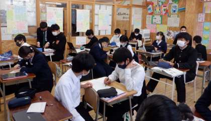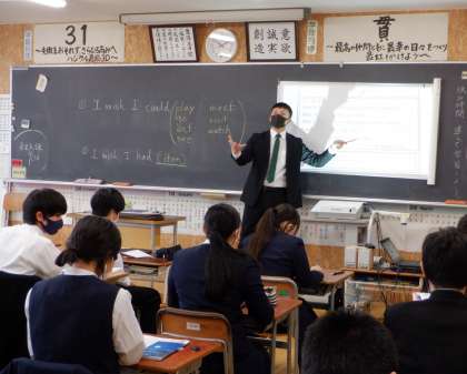 3−Dの英語の授業風景です。今日はALTの先生と一緒に、英文で手紙を書くという学習をしています。分からないところは、積極的に先生に質問しています。やるね!3年生!
