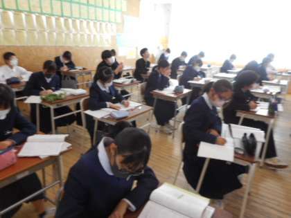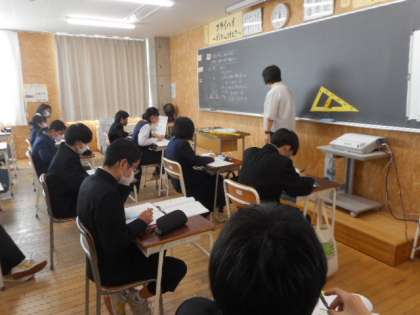 三角形の性質について 2−C数学 公開日 2022/12/09 更新日 2022/12/09 芝園の一日 12月9日(金) 4限 2−Cの数学の授業風景です。三角形の性質に着目して証明問題に取り組みました。図形をじっと眺めて、答えまでの筋道を考えました。