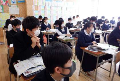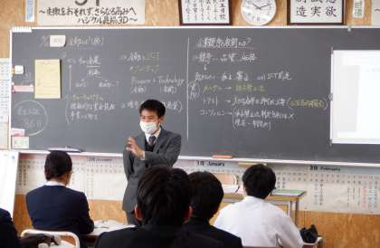 3−Dの社会の授業風景です。「企業の役割」について学習をしています。「勤めるということは」という大きな課題について、生徒は自分のこととして真剣に考えているようです。