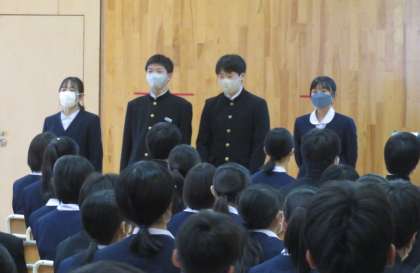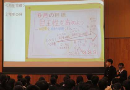 笑顔の花集会 その4 公開日 2022/12/12 更新日 2022/12/12 芝園の一日 12月12日(月) 5限 3年生は、中学校生活3年間のGSSの取組を紹介しました。月別目標の立て方、どうやってみんなで取り組んでいけばよいかなど、後輩にとっては勉強になることばかりでした。 「芝園プライド」は脈々と継承されています。