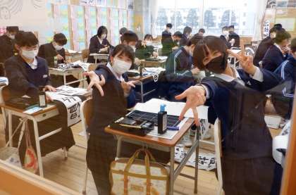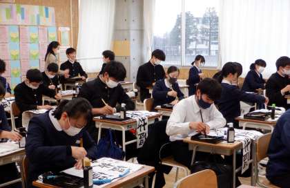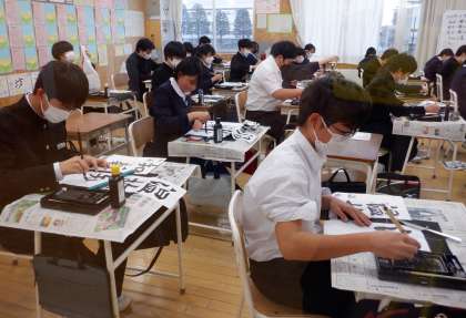 3年生は「温故知新」を行書で書きます。中学校生活最後の「書き初め大会」となります。集大成として、精一杯頑張ってほしいです。笑顔もバッチリ!