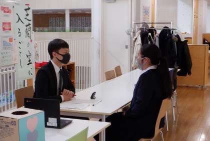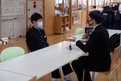 1−Bの英語の授業風景です。今日は、ALTの先生と一人ずつ英会話をしています。自分の言いたいことが上手く伝わるかな・・・。