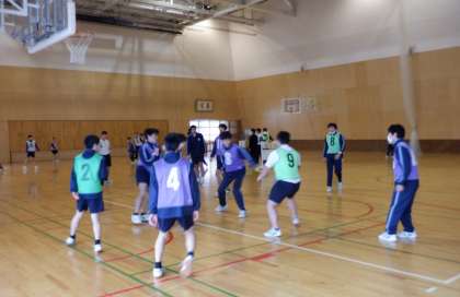 体育大好き! 3−A,D男子 公開日 2022/12/20 更新日 2022/12/20 芝園の一日 12月20日(火) 2限 3−A、D男子の体育の授業風景です。男子はバスケットボールをしています。素早い動き、さすが3年生です。