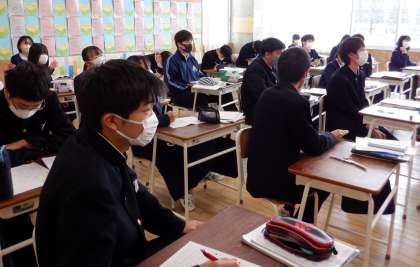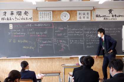 3−Bの英語の授業風景です。「『If〜』を使って、自分の願望を伝えよう」という課題で学習をしています。グループで考えた英作文を発表しています。