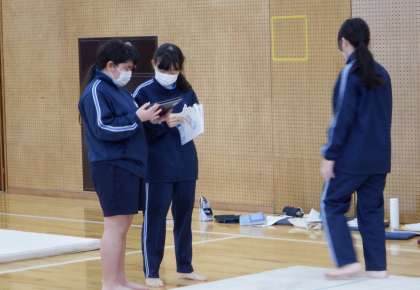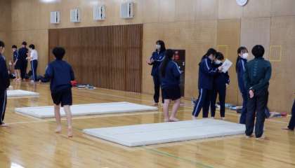 技に挑戦! 1−B体育 公開日 2022/12/21 更新日 2022/12/21 芝園の一日 12月21日(水) 2限 1−Bの体育の授業風景です。マット運動に取り組んでいます。倒立前転、開脚前転、後転など、様々な種類の技に挑戦しています。