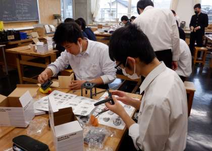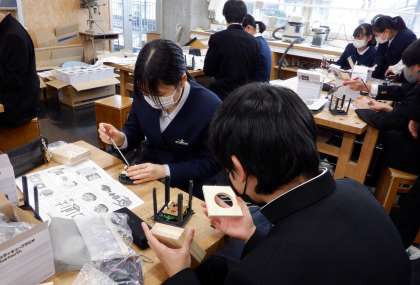 3−Cの技術の授業風景です。木製のラジオを製作しています。