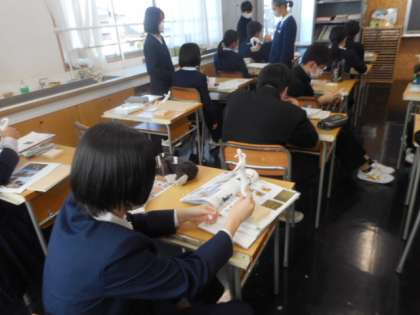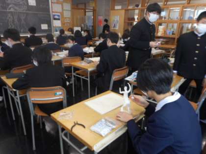 2−Cの美術の授業風景です。スポーツ選手や動物が動いている様子を紙粘土を使って表現しました。まるで本当に動いているような仕上がりになってきました。