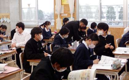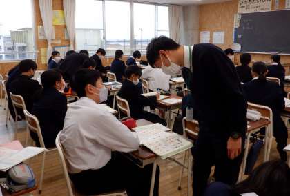 1−Bの英語の授業風景です。「私は〜が好きです」「私は〜が好きではありません」という短文を作っています。できた人から、ALTの先生に見てもらっています。英文を書くことにも、ずいぶん慣れてきましたね。