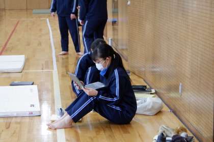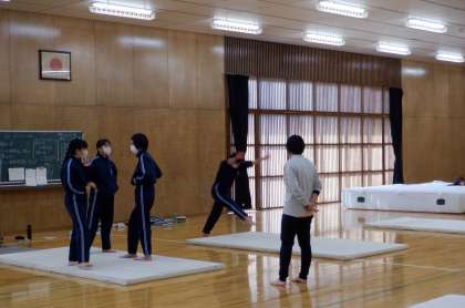 3−A、Dの体育の授業風景です。女子は、マット運動をしています。倒立前転、開脚後転など、技の連続を考えて練習しています。
