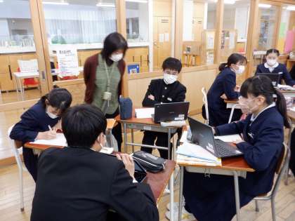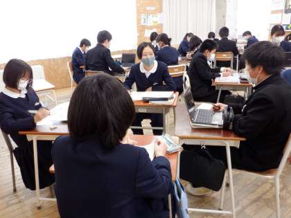 課題解決学習に取り組んでます 2−C家庭科 公開日 2023/01/20 更新日 2023/01/20 芝園の一日 1月20日(金) 3限 2−Cの家庭科の授業風景です。生徒は「食生活チェックシート」を使って、自分の食生活に関する課題を見つけました。今日は、その結果から一人一人が自分の課題について、どのように解決していくか解決策を考えています。野菜不足、糖の取り過ぎ、楽しい食事など、それぞれが自分の課題を解決します。生徒は、とっても意欲的です!