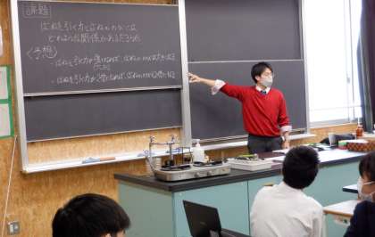 1−Cの理科の授業風景です。ばねののびと力について、考察しています。数学で学習した「比例の関係」に着目している生徒もいます。