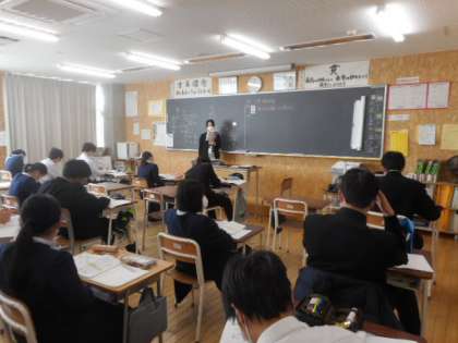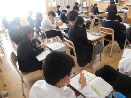 3−Bの数学の授業風景です。標本調査について学習しています。身近な例などから、どのようにして調査をしているかを学び、理解を深めました。