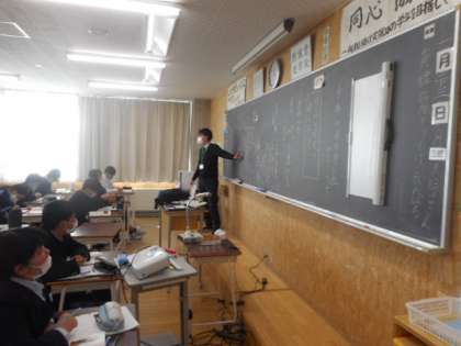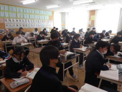 1−Bの国語の授業風景です。 「少年の日の思い出」を読み、登場人物の関係を捉えました。「エーミールって嫌なやつなのかな」、「そうは思わないよ」など色々な意見が交わされました。