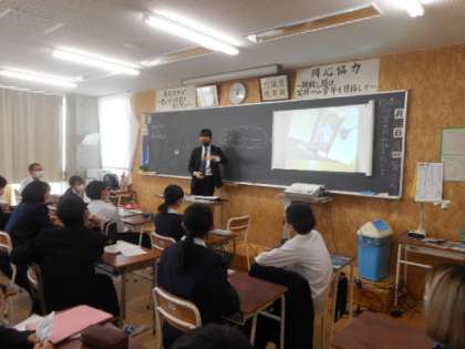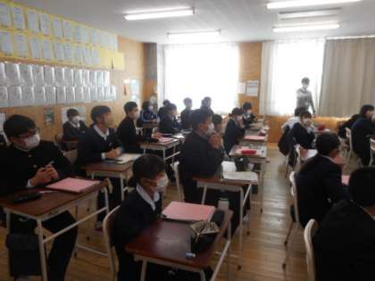 1−Cの英語の授業風景です。ALTの先生とゲームを通して、これまで学習した英語で会話を楽しみました。ゲームのお題を聞くと「ワー」っと歓声が上がりました。楽しみながらも英語が上達していってます。
