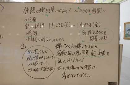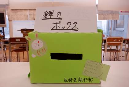 後期生徒会では「仲間の輝きを見つけよう〜キラキラ週間〜」の活動をしています。各学年のフロアには、友達のよさを書き込むカードが置いてあります。