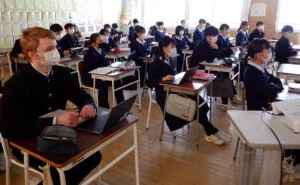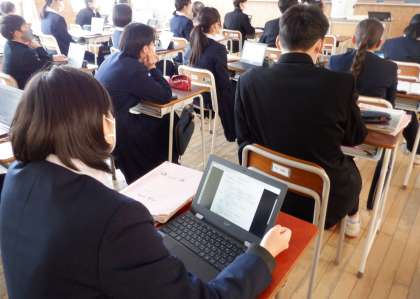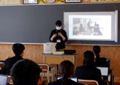 2−Dの英語の授業風景です。英語でのプレゼンテーションの仕方について学習をしています。いかに聞き手に分かりやすく伝えることができるか。生徒は真剣に聞いています。