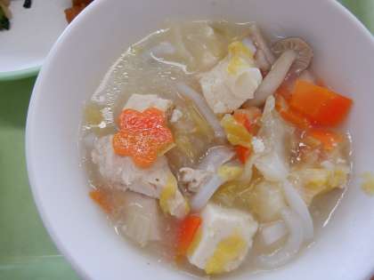 塩こうじ鍋の中に、花形の「ラッキーにんじん」を発見!よいことが起きそうで嬉しいです。いつもおいしい給食を、ありがとうございます!
