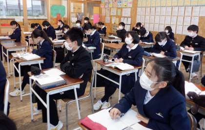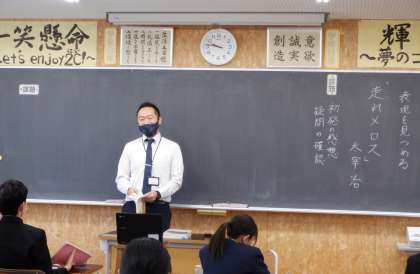 2−Cの国語の授業風景です。「走れメロス」の初発の感想を確認しています。生徒はメロスに感情移入して、読み深めています。
