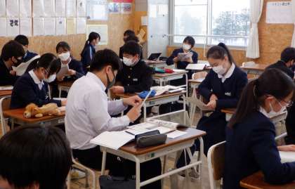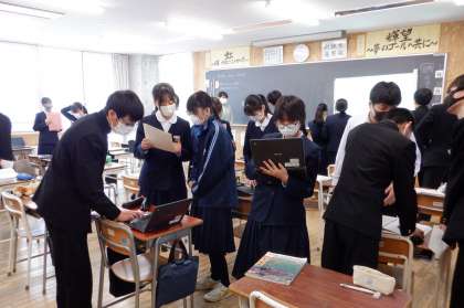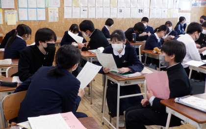 2−Aの英語の授業風景です。次回の「英語でプレゼン」の打ち合わせや、単語練習などグループやペアで話し合って進めています。コミュニケーションを図ることは大事ですね。