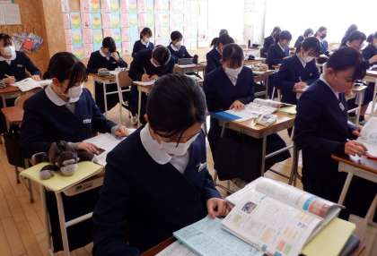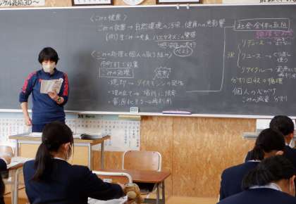 3−A、D女子の保健体育の授業風景です。「廃棄物の衛生管理」について学習をしています。ゴミの問題は重要です。一人一人が、なるべくゴミを出さない生活を考えていかなければなりませんね。