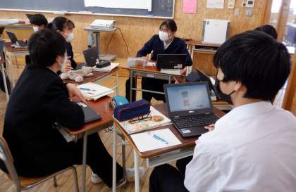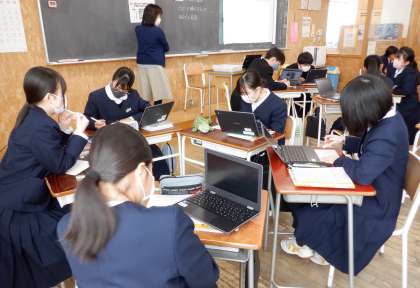 2−Bの家庭科の授業風景です。「18歳の私が○○を購入するには・・・」という課題で学習をします。成人年齢が引き下げられ、18歳になればできることがたくさんあります。あと4〜5年もすれば成人となります。生徒は、想像しながら課題に取り組んでいました。