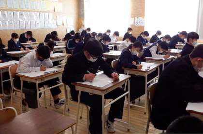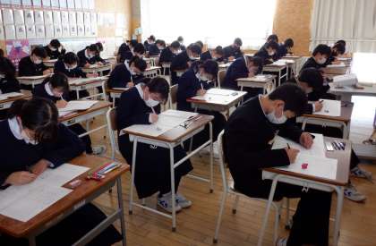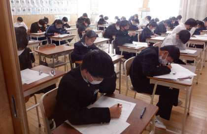 3年生の私立一般入試に合わせて、1・2年生も校内学力調査に取り組んでいます。画像は、1年生です。試験に取り組む態度にも、より集中力が見られるようになってきました。