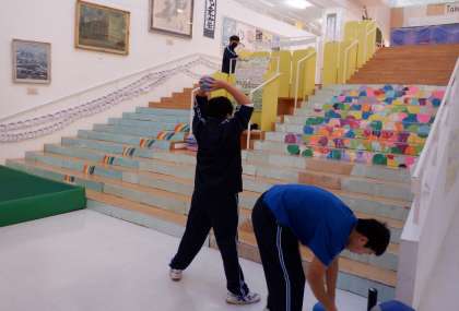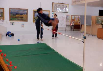 グラウンドが使えない冬期間は、校舎内を工夫して部活動をしています。画像は、陸上競技部です。大階段のスペースを活用しt、絵高飛び、砲丸のトレーニングをしています。