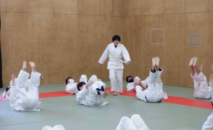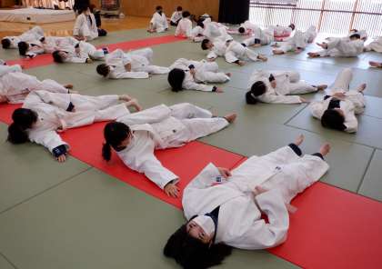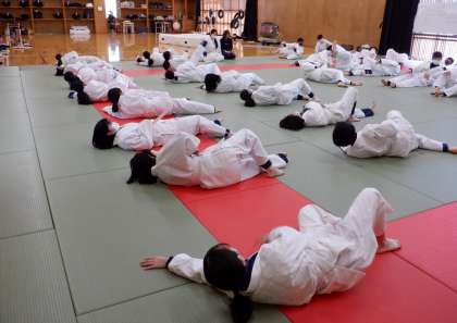 1−Aの体育の授業風景です。柔道の学習をしています。受け身の基本形を身に付けるよう、何度も繰り返し稽古しています。少しずつ様になってきています!