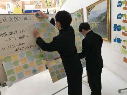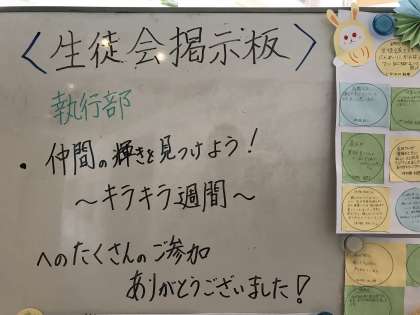 仲間の輝きを見つけようーキラキラ週間ー 公開日 2023/02/06 更新日 2023/02/06 芝園の一日 2月6日(月) 生徒会による「仲間の輝きを見つけようーキラキラ週間ー」が行われました。仲間の良いところを書いて掲示しました。お互いの良さを見つけるきっかけになるといいですね。