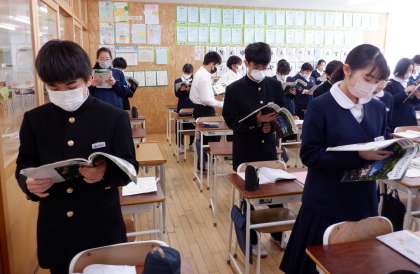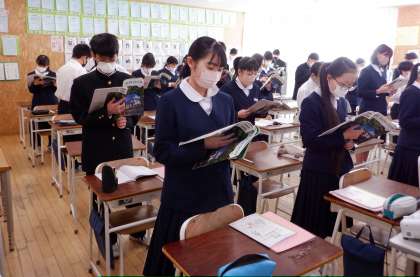 1−Bの英語の授業風景です。教科書の英文の読む練習をしています。英語では「話す力」は大事です。まずは声に出して、相手に伝わるように練習をしましょう。
