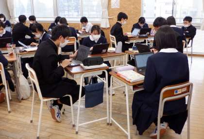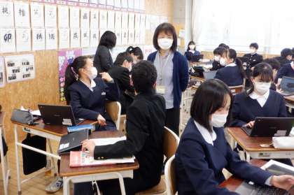 1−Aの家庭科の授業風景です。今日は各自が家庭で行った「お肉料理をつくろう」の課題を終えて、発表の準備をしています。生姜焼き、ハンバーグ、サムギョプサルなど、美味しそうな料理を作ったようです。実習を行って、どんな学びがあったか・・・。発表が楽しみですね。