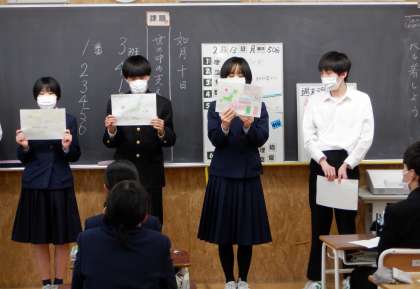 世界の支え合いを紹介しよう 3−C国語 公開日 2023/02/10 更新日 2023/02/10 芝園の一日 2月10日(金) 5限 3−Cの国語の授業風景です。「世界の支え合いを紹介しよう」という課題で、グループ毎に発表をしています。