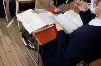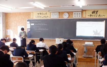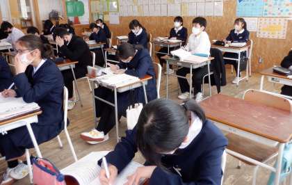 2−Bの英語の授業風景です。英語の大切な活動の一つに「書く」ことがあります。生徒は、地道な「書く」活動も手を抜くことなく頑張っています。