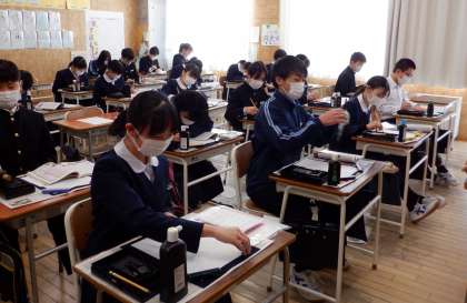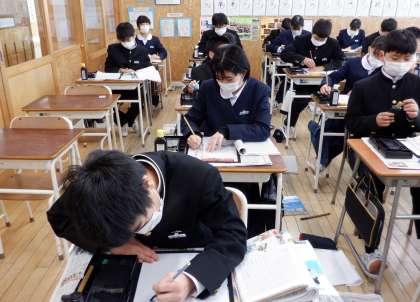 小倉百人一首に挑戦 1−C国語 公開日 2023/02/16 更新日 2023/02/16 芝園の一日 2月16日(木) 2限 1−Cの国語の授業風景です。自分の好きな「小倉百人一首」を毛筆で書いています。小筆は難しいですが、集中しています。