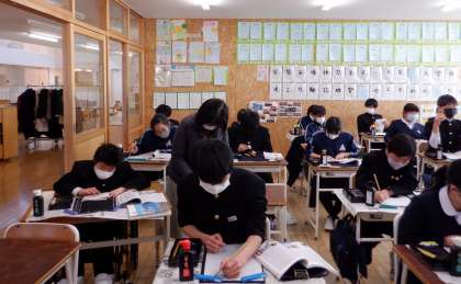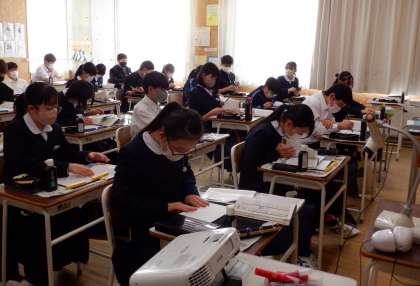 1−Bの国語の授業風景です。習字の学習をしています。お気に入りの「小倉百人一首」を小筆で書いています。真剣ですね。