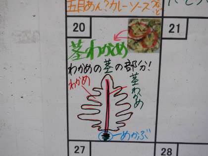 給食カレンダーには、栄養教諭さんが書いた茎わかめのイラストが載っていました。わかめの体のつくりは、興味深いですね。