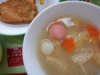 紅白白玉汁の中には、花形の「ラッキーにんじん」と「ラッキー大根」が入っていました。嬉しくなりますね。