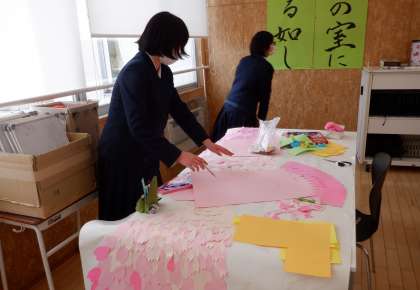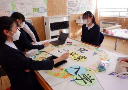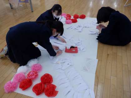 学年末考査も終わり、放課後、芝中生はそれぞれの活動に励んでいます。2学年のフロアでは、卒業式に向けて祝画の制作をしています。鳥の羽根や花々など、とても細かな作業です。心を込めて、仕上げています!